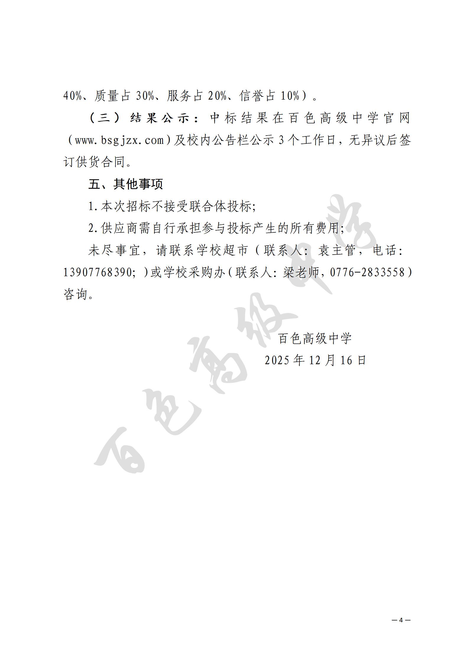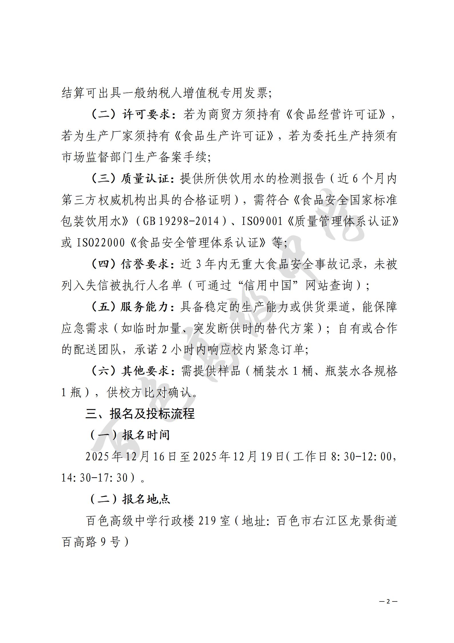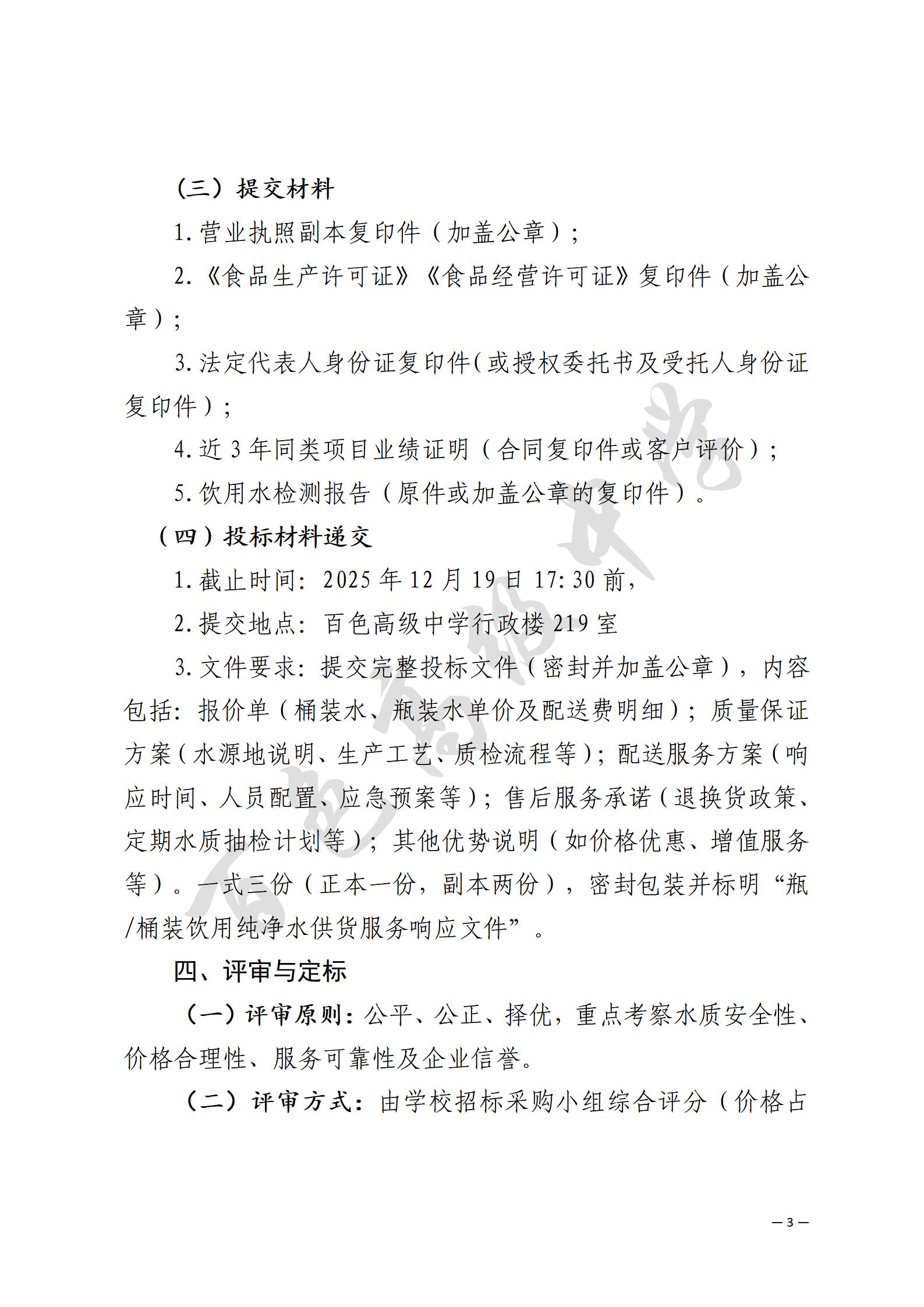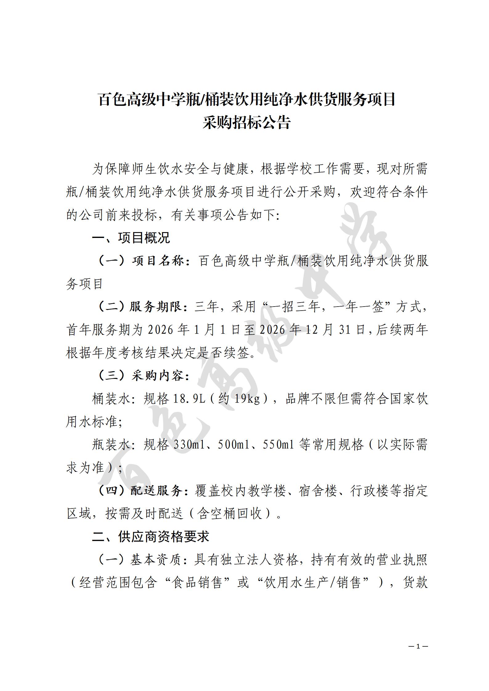 百色高级中学瓶/桶装饮用纯净水供货服务项目采购招标公告