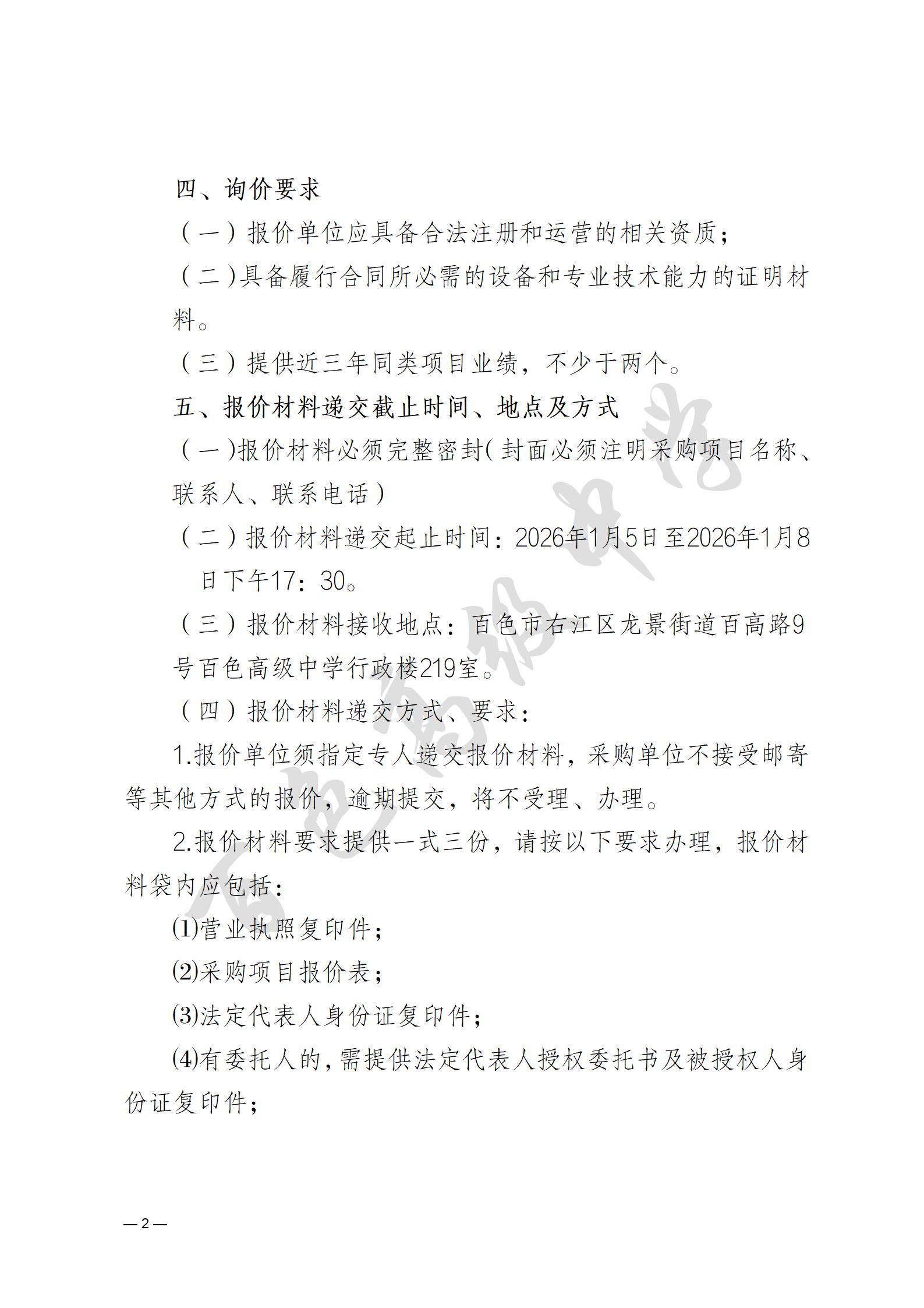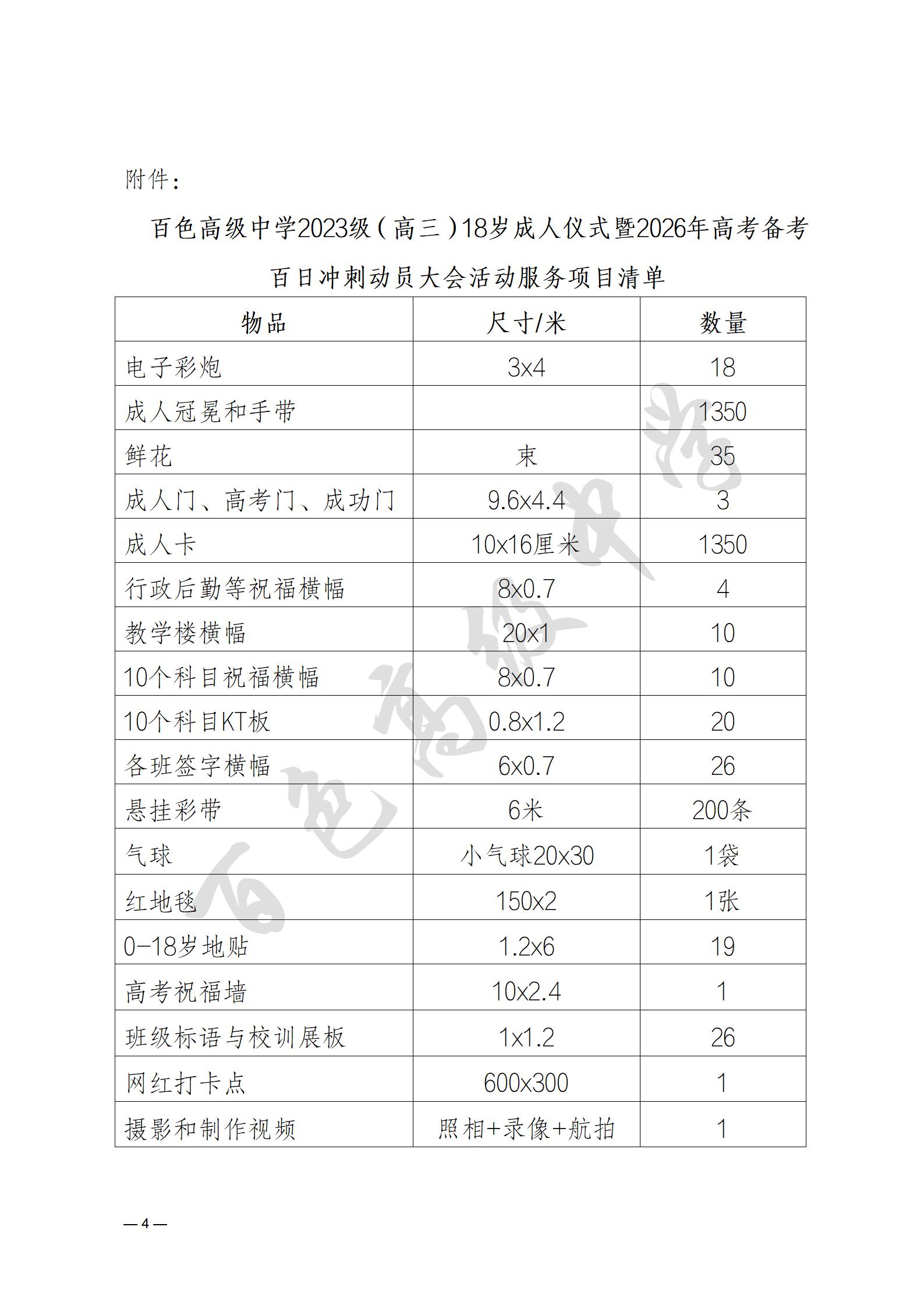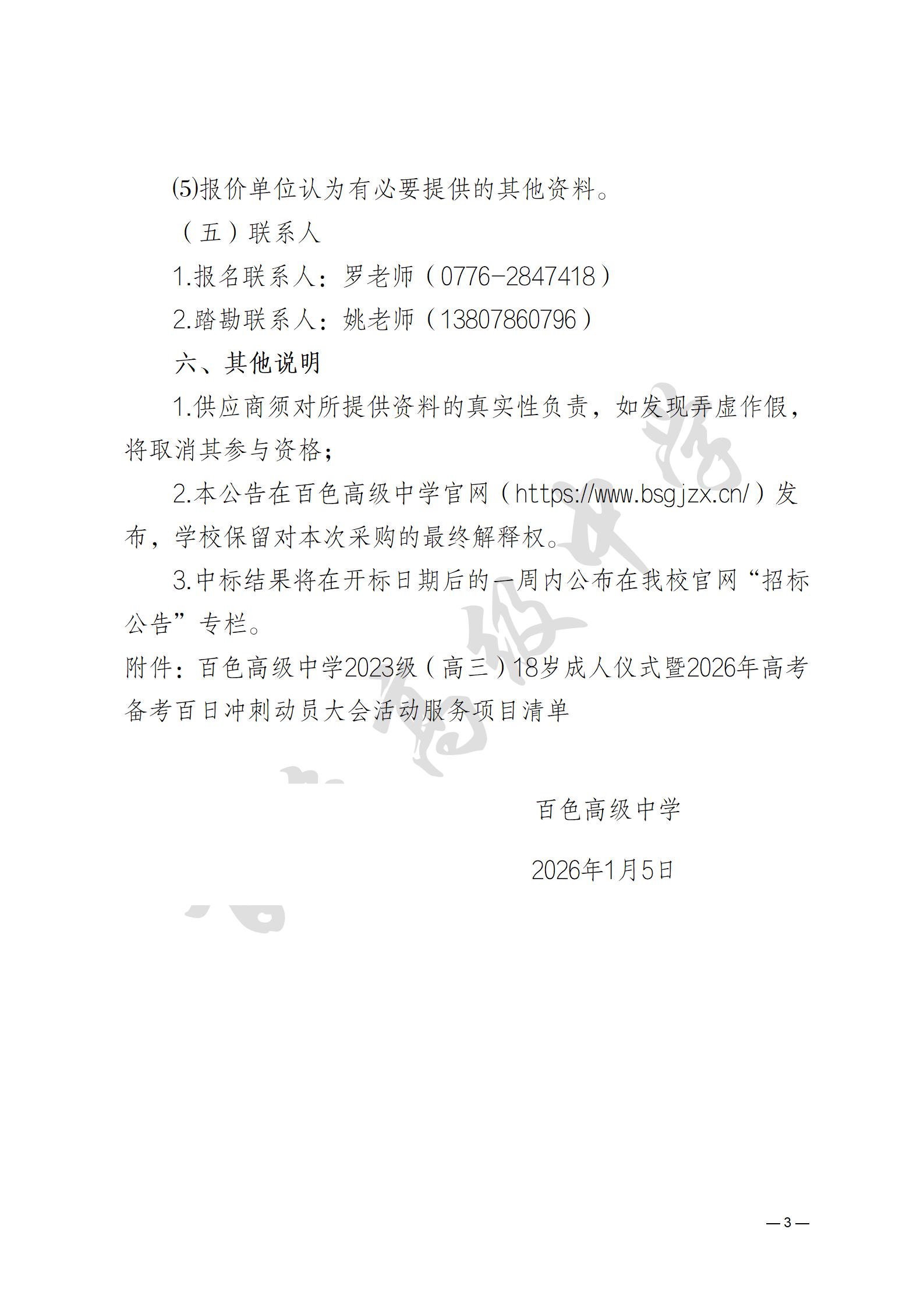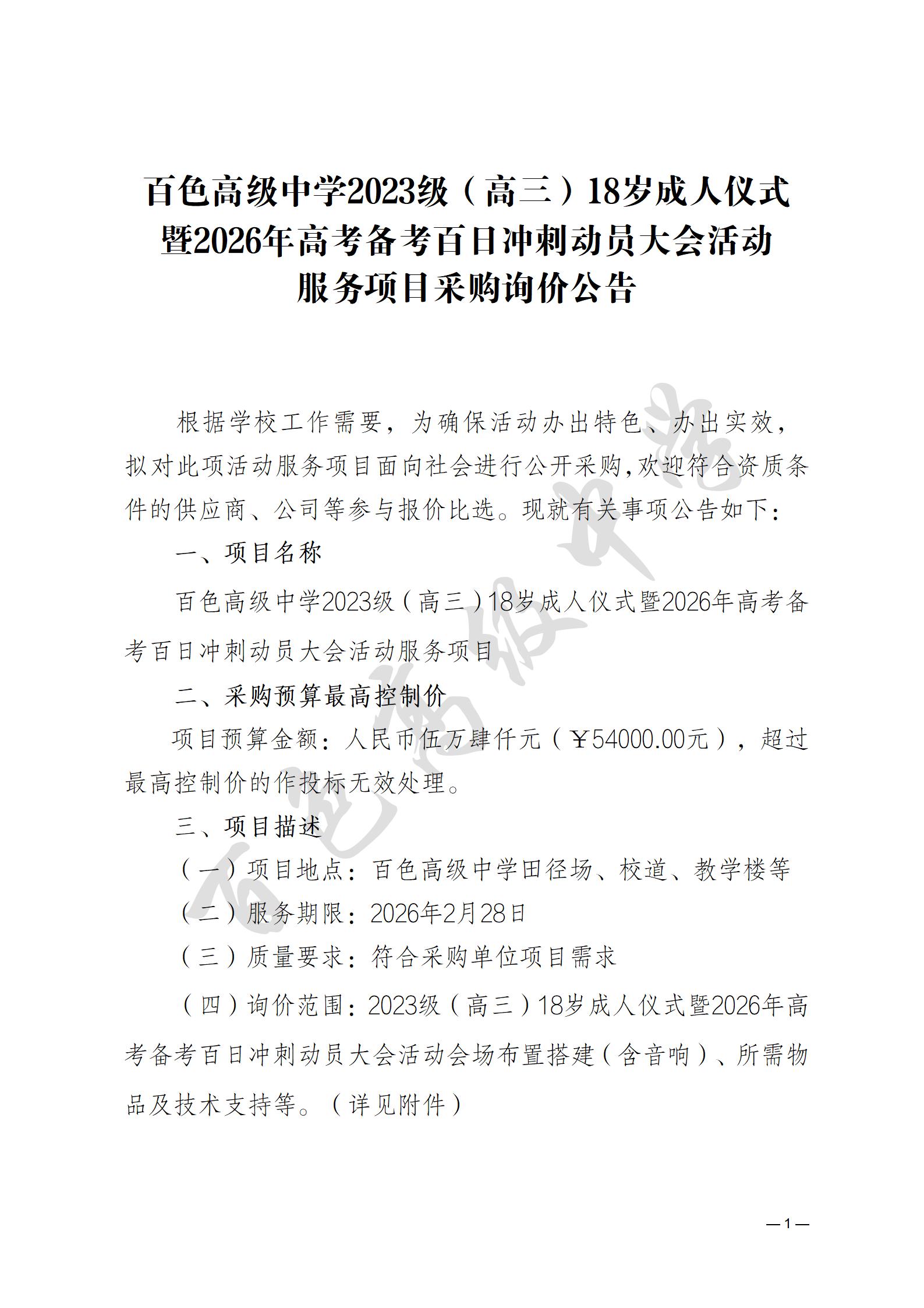 百色高级中学2023级(高三)18岁成人仪式暨2026年高考备考百日冲刺动员大会活动服务项目采购询价公告