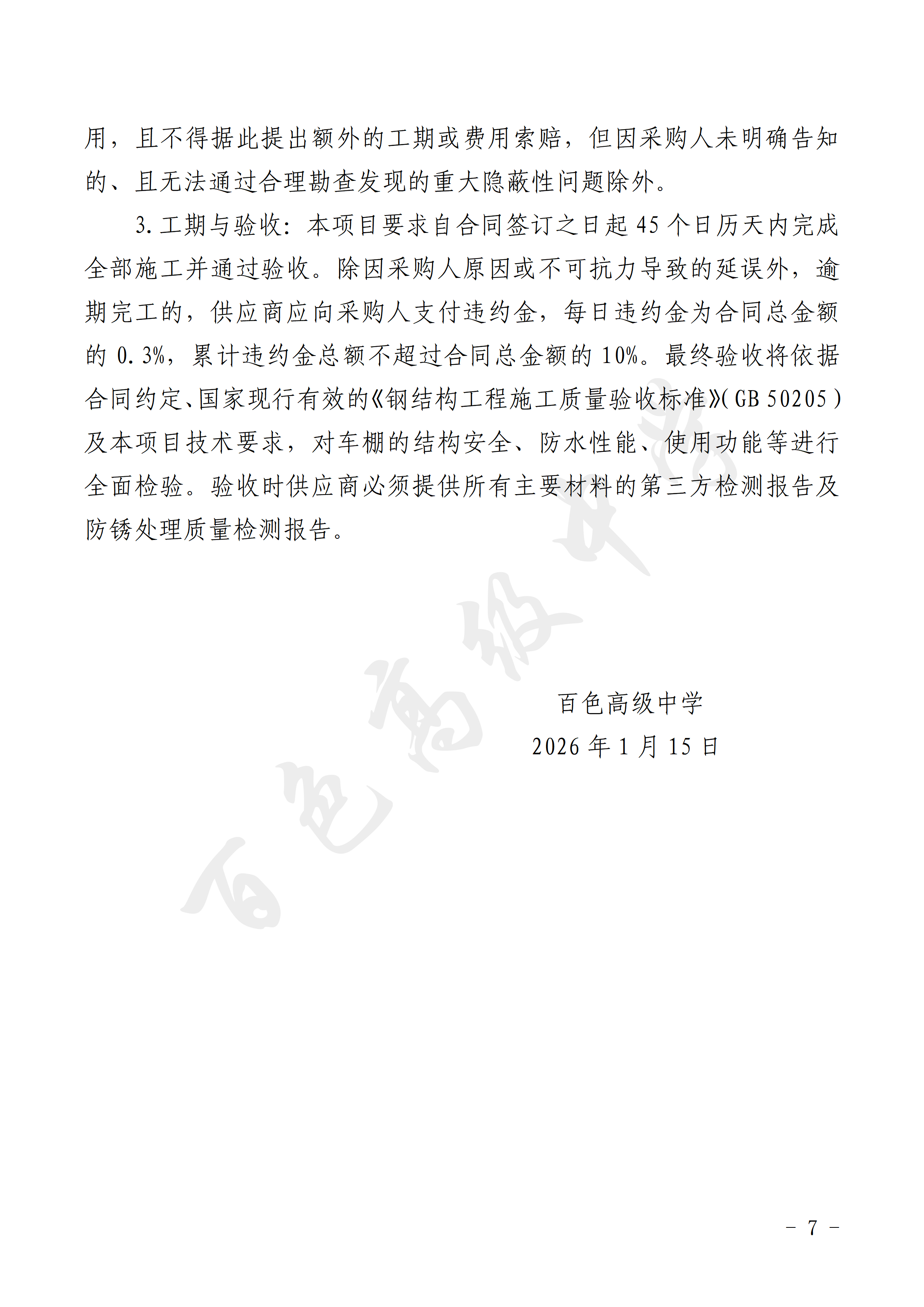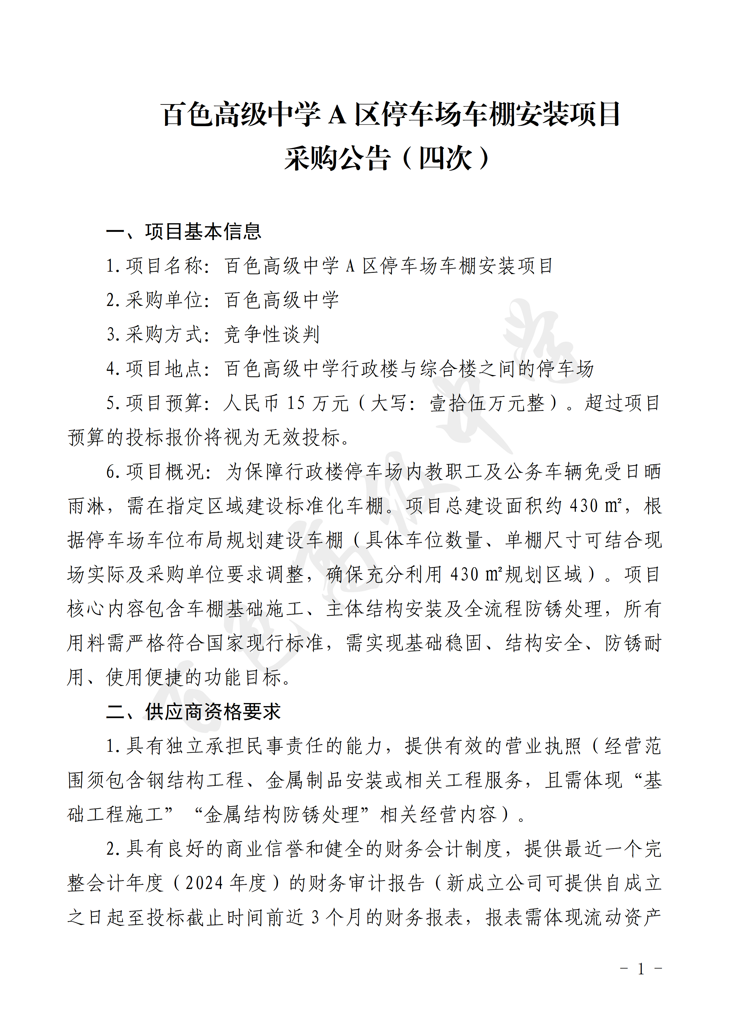 百色高级中学A区停车场车棚安装项目 采购公告(四次)