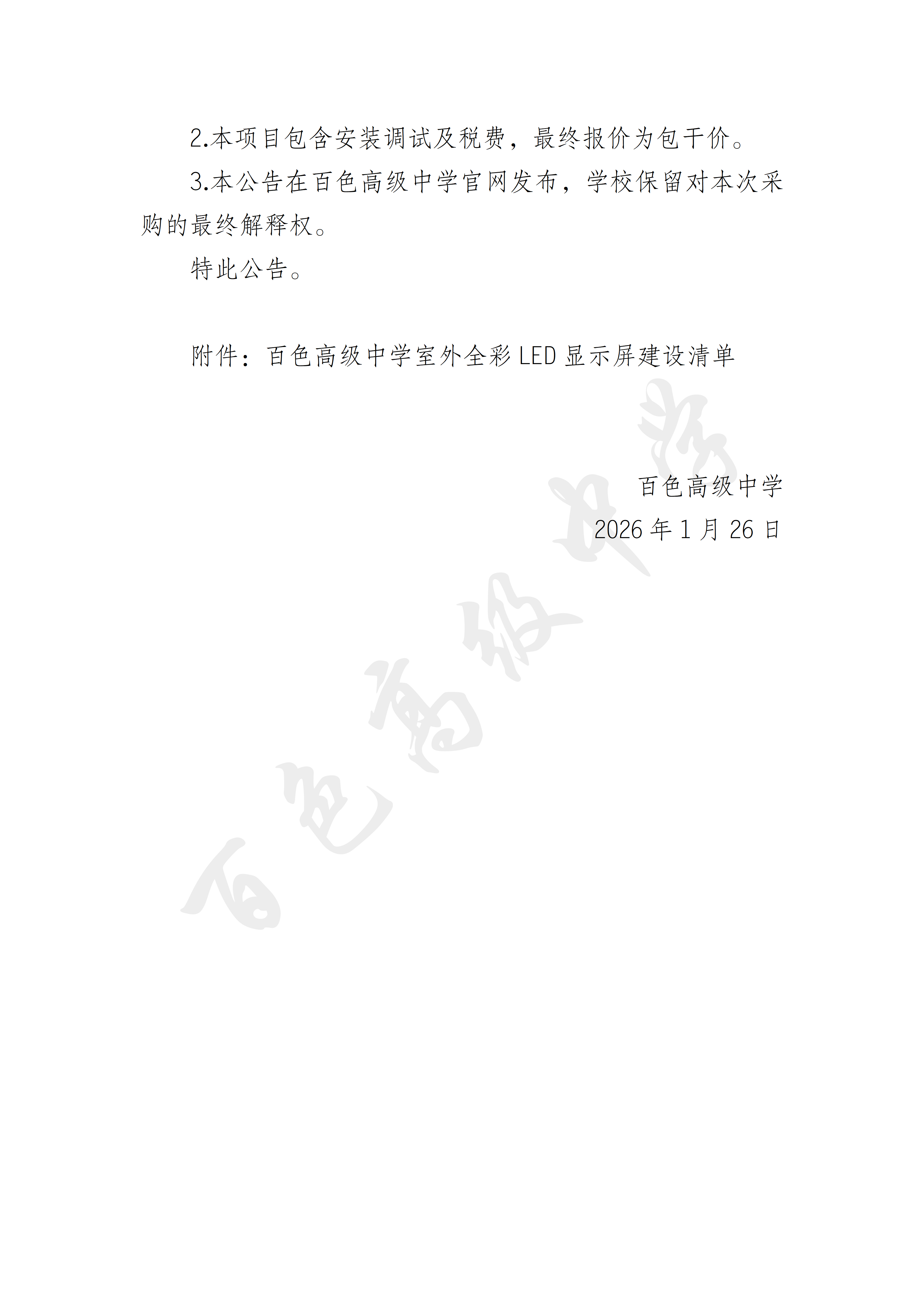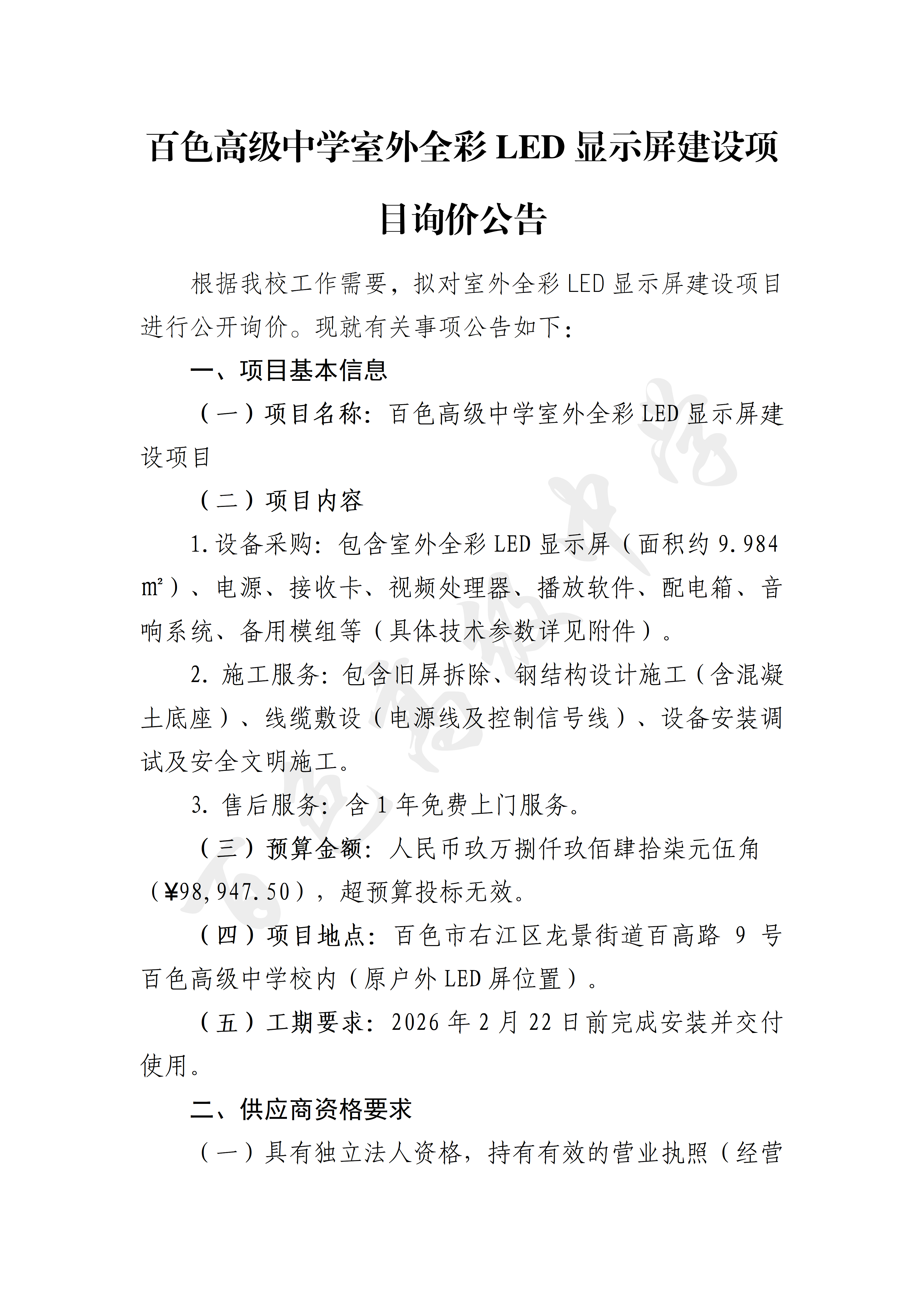 百色高级中学室外全彩LED显示屏建设项目询价公告