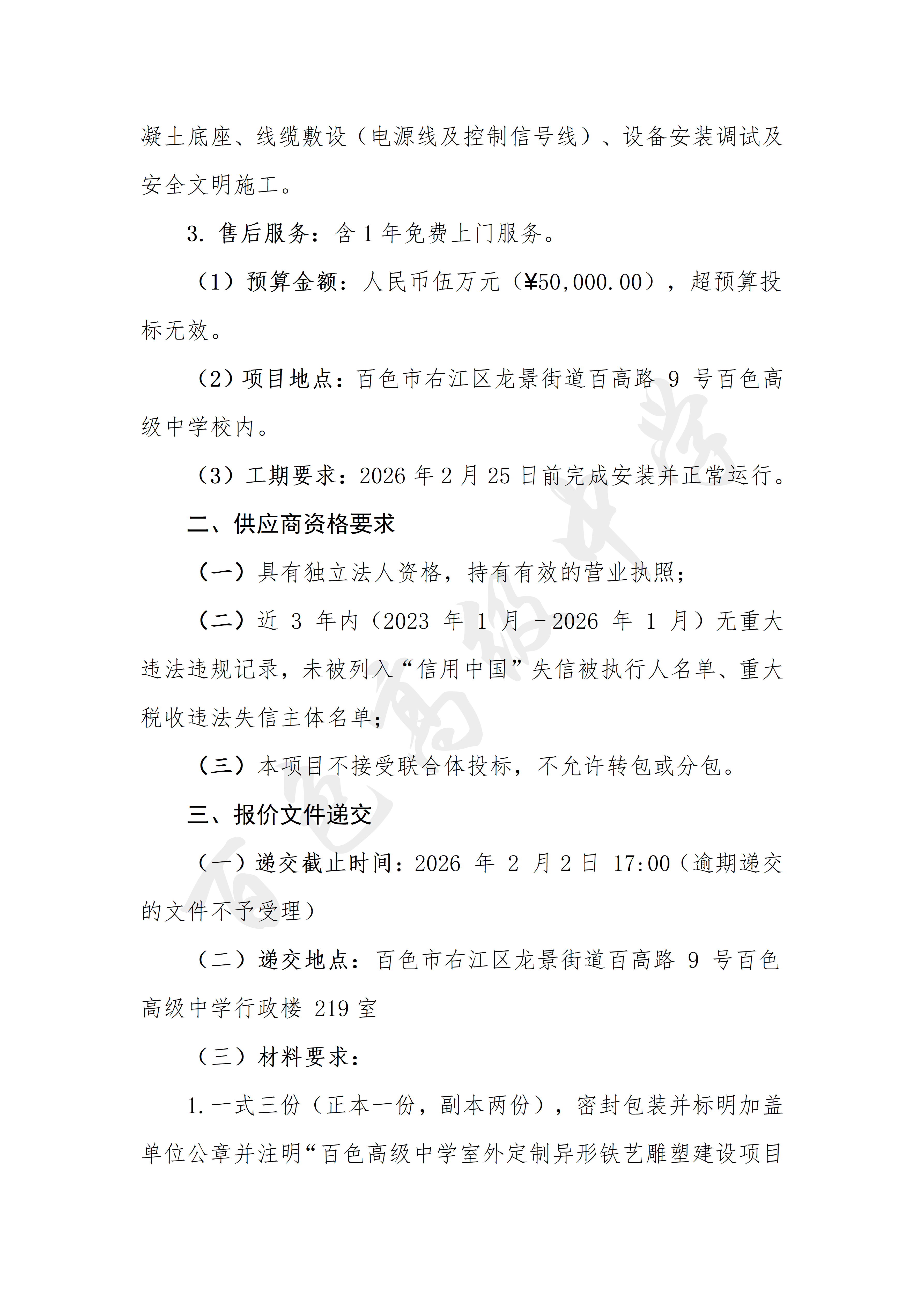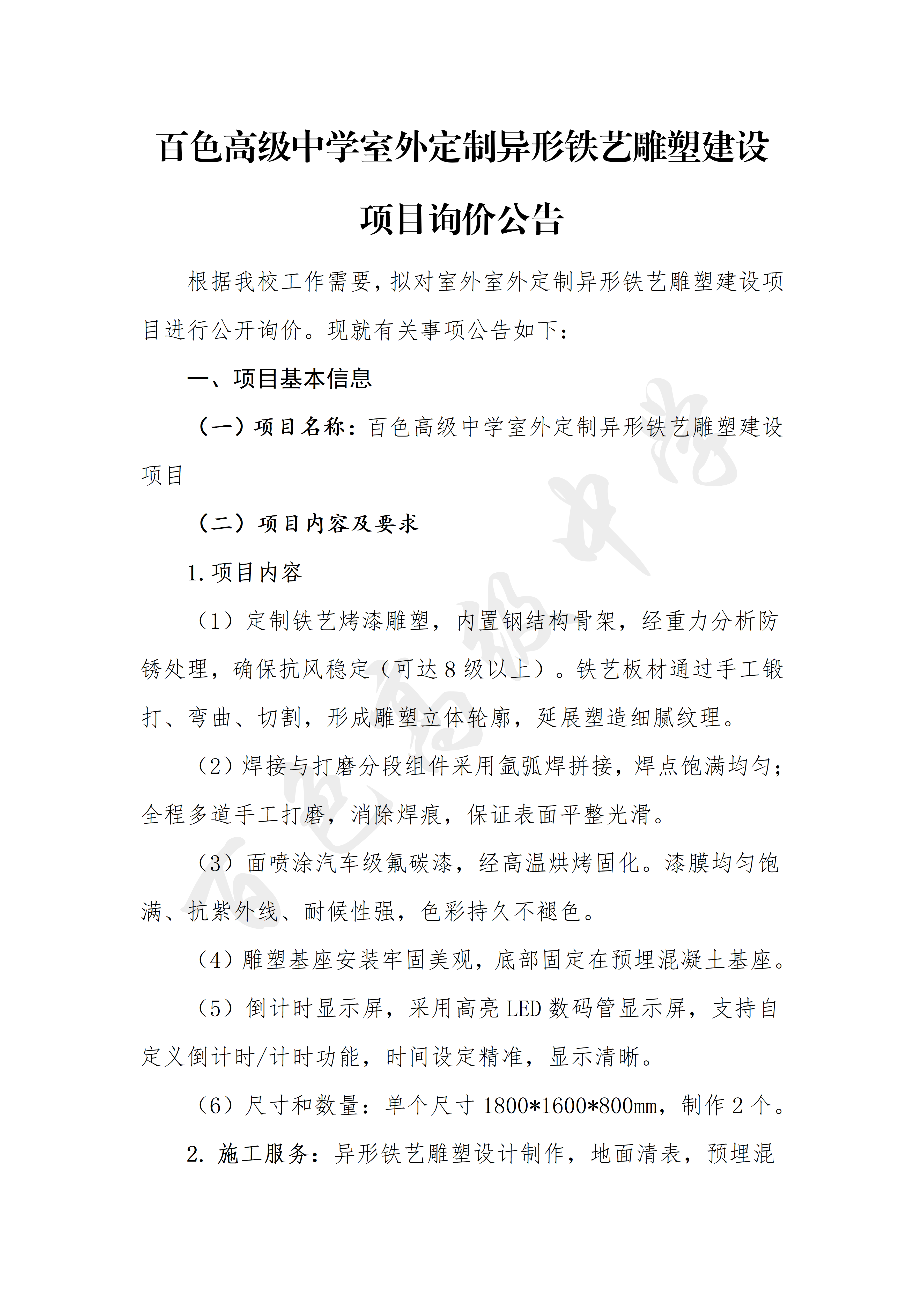 百色高级中学室外定制异形铁艺雕塑建设项目询价公告