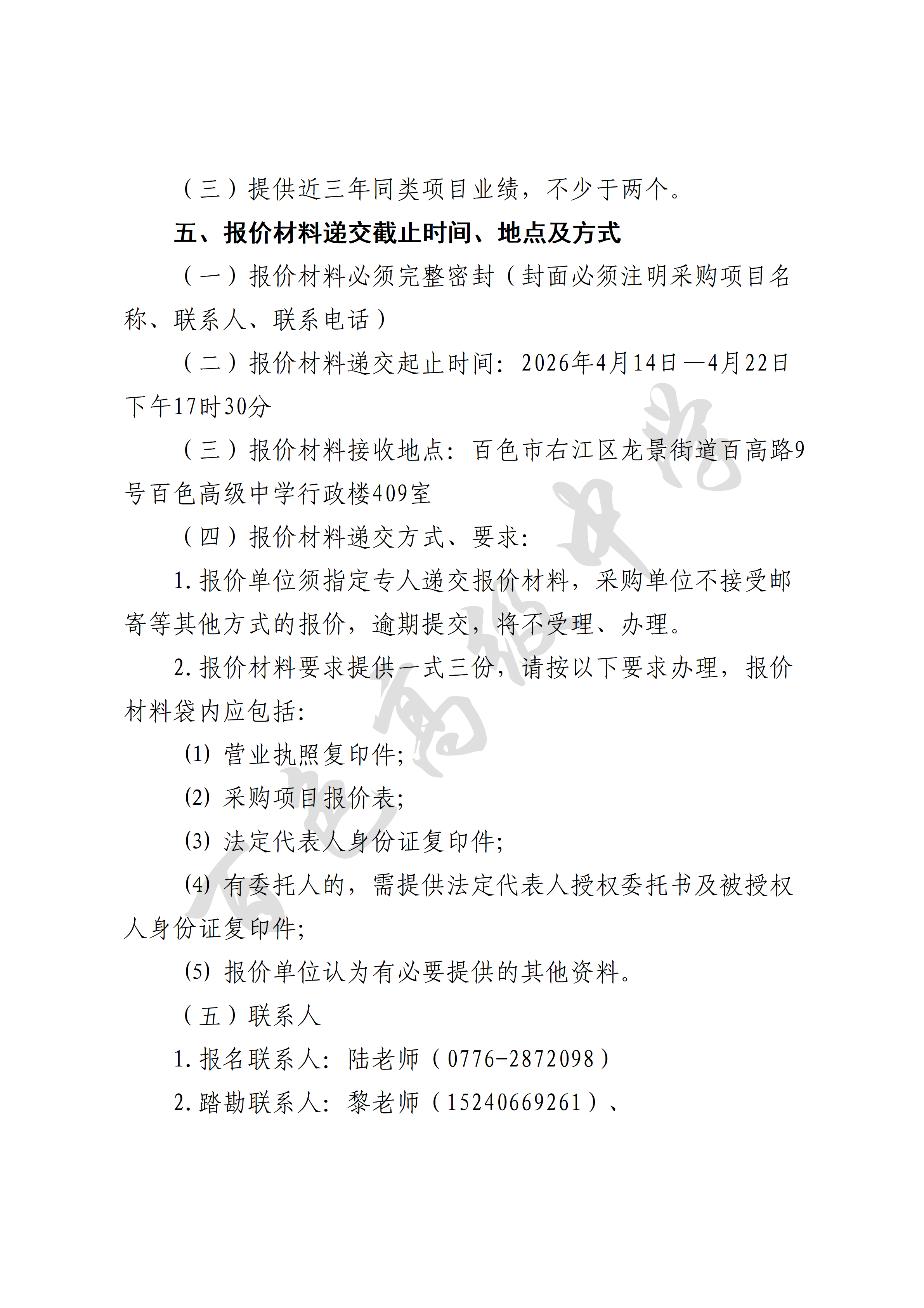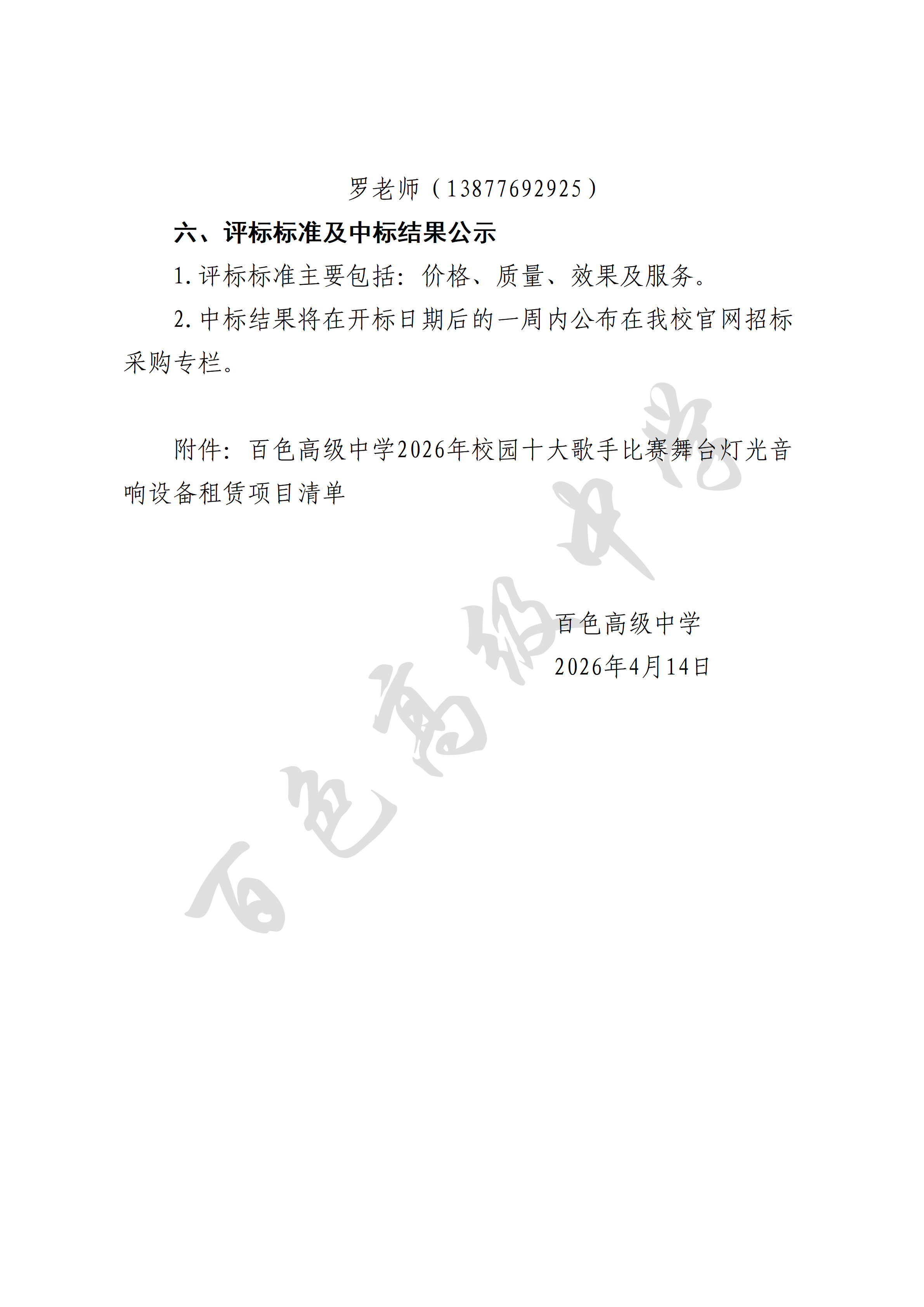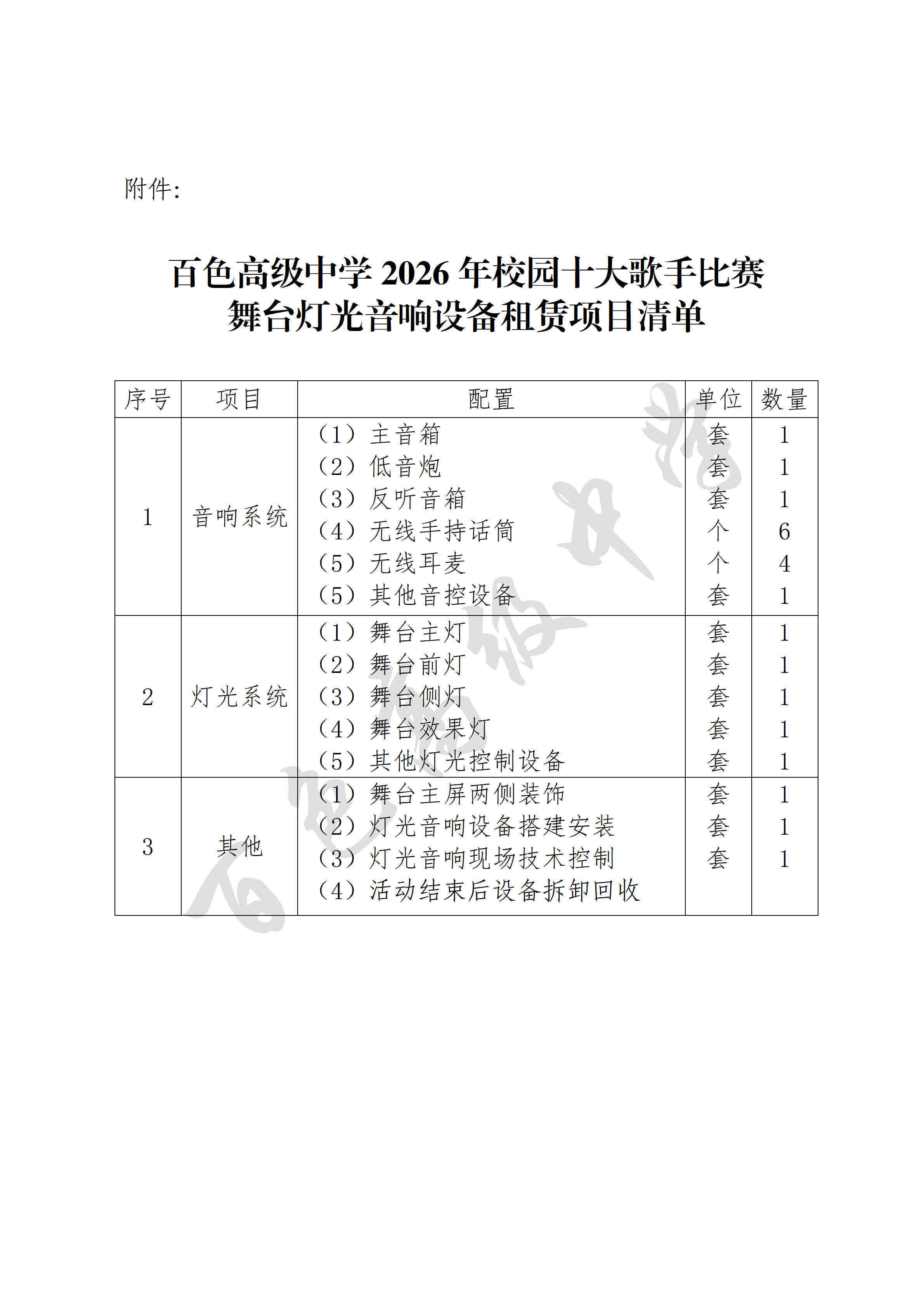 百色高级中学2026年校园十大歌手比赛 舞台灯光音响设备租赁项目询价公告
